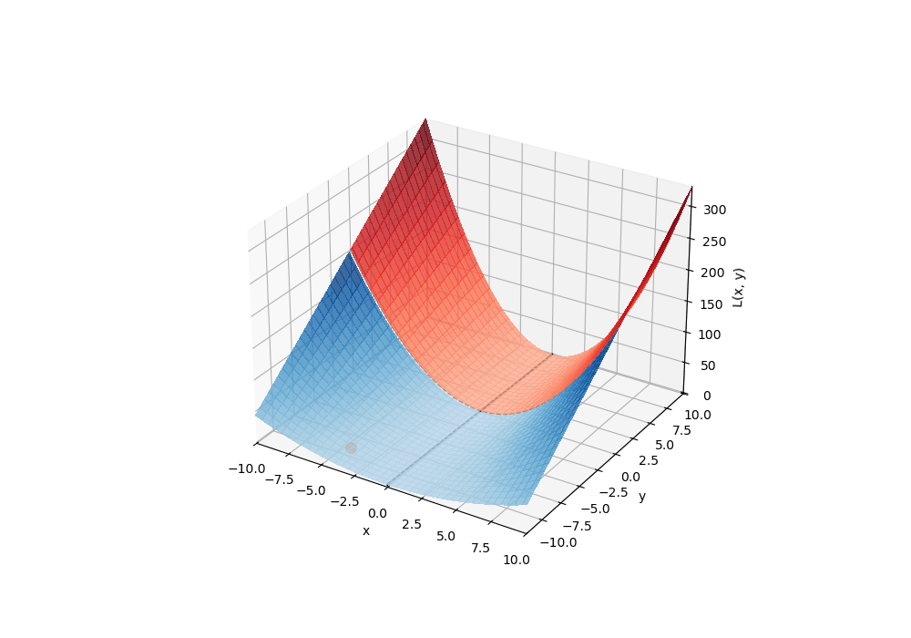 To build up a mental picture of this, let’s pick the smaller landscape in which progressive sharpening is present: there are 2 variables, the gradient (going down inside the screen) points in a direction in which the Hessian grows (in the perpendicular direction).