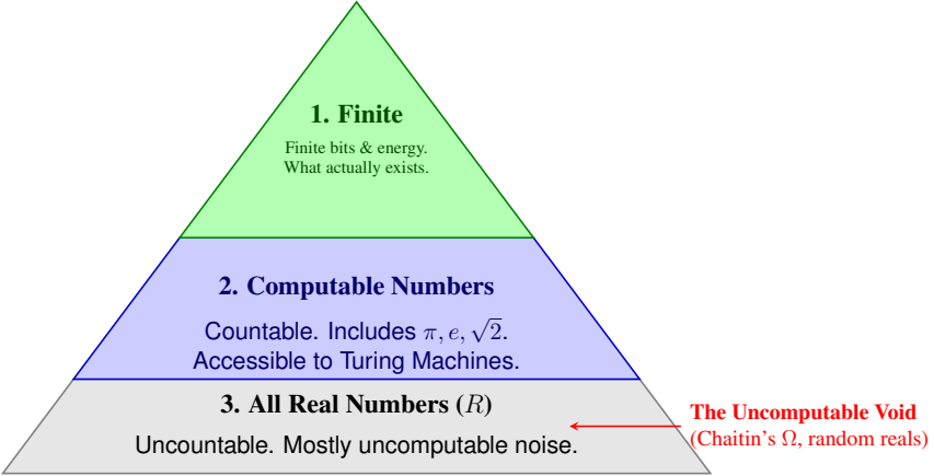 Figure 1: The Hierarchy of ”Reality.” While mathematics assumes the existence of the entire gray pyramid (the continuum), computation is restricted to the blue triangle, and physical reality— limited by finite energy and entropy—is restricted to the green tip. Most real numbers are mathe-matical fictions that can never be measured or stored.