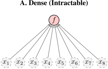 Figure 1: Visualizing the Difference. Left: A dense function where the output depends directly on all inputs (high fan-in). Right: A sparse, compositional function where the output is computed via a hierarchy of local operations (bounded fan-in).